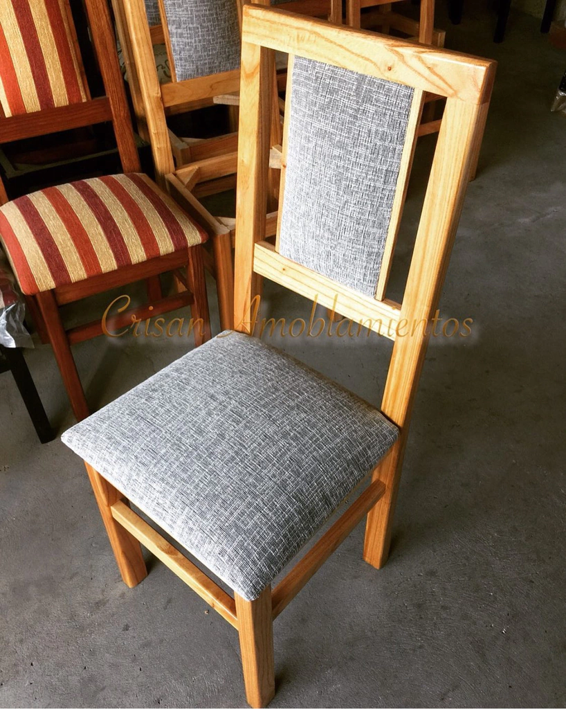 Crisan Amoblamientos Estilo ,diseño & Calidad Nuestras sillas Pilar son fabricadas en madera maciza paraíso de selección, con escuadras,refuerzos laterales y frontales , también se encuentran bien espigadas (no tarugos) pegadas con cola poliuretano y clavadas ,todos estos complementos le otorgan mayor resistencia y firmeza . Asientos en goma de alta densidad 28Kgs. Lustres a Elección,Negro ,Roble natural,Roble ,Caoba ,Nogal ,Cedro claro y Oscuro. Tapizados en talampaya,Chenille ,telas Antonela desgarros ,Pana y telas Linos con proceso antimanchas a Elección.